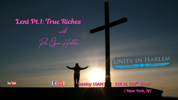 Rev. Ogun Holder joins us with his talk "Lent Pt. 1: True Riches". Join us online or in person at 318 W. 139th Street , Harlem NYC. As we start a new chapter at Unity In Harlem, we hope you will join us as we bring in a new year with renewed